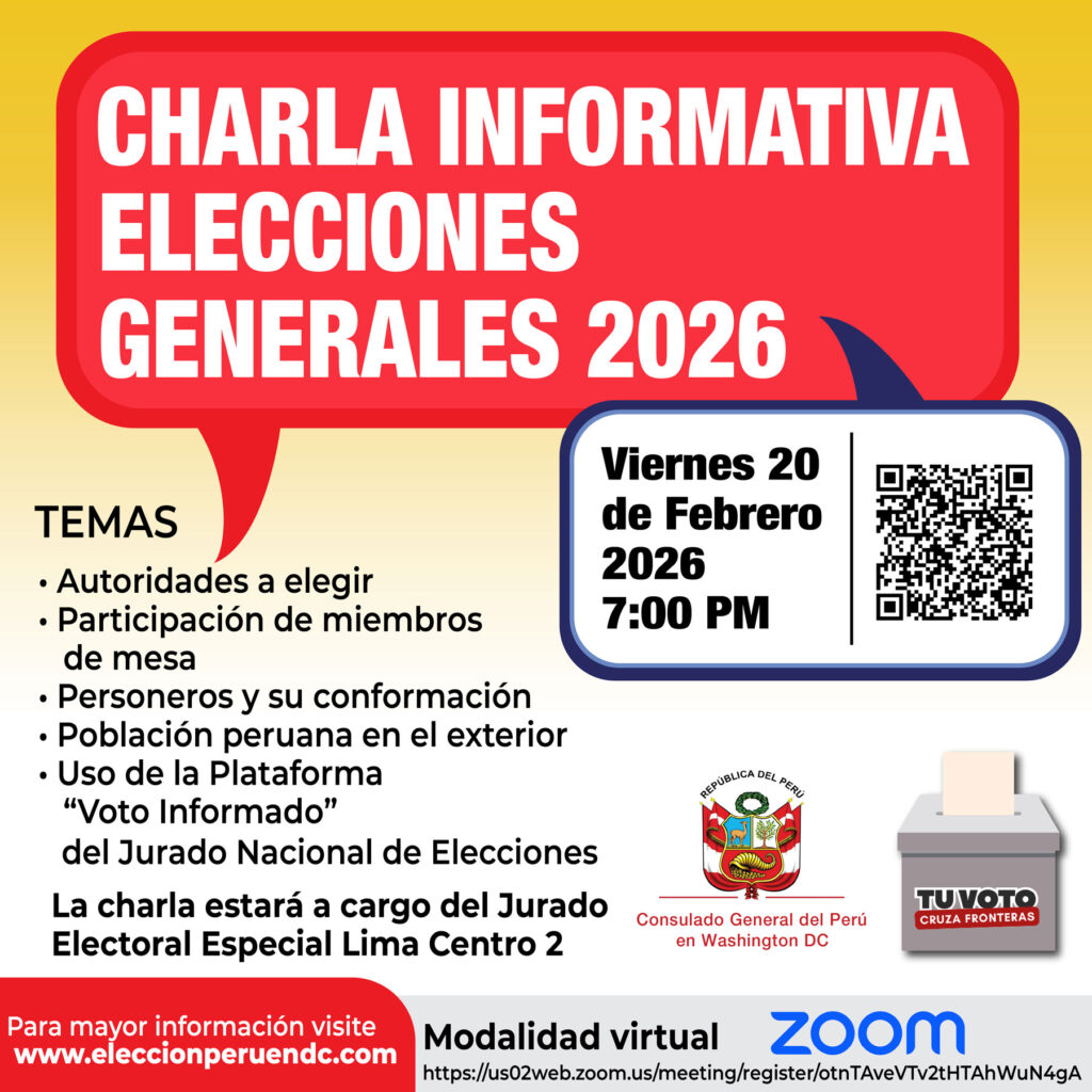 Estimado connacional, lo invitamos a participar este viernes 20 de febrero a las 7 pm en esta charla informativa sobre las ELECCIONES GENERALES 2026.